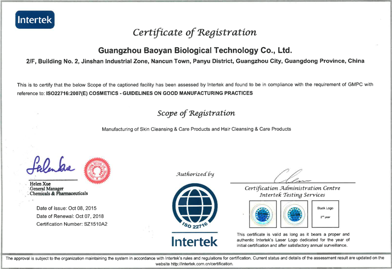 廣州葆妍生物科技有限公司位于廣州番禺金山工業園,成立于2009 年,經營面積20000平方,集化妝品(護膚類、彩妝類)配方開發、生產加工于一體,專業化、規模化的化妝品OEM/ODM/OBM企業。 “追求卓越,秉承健康,成就美麗”的經營理念,致力于健康美麗事業。